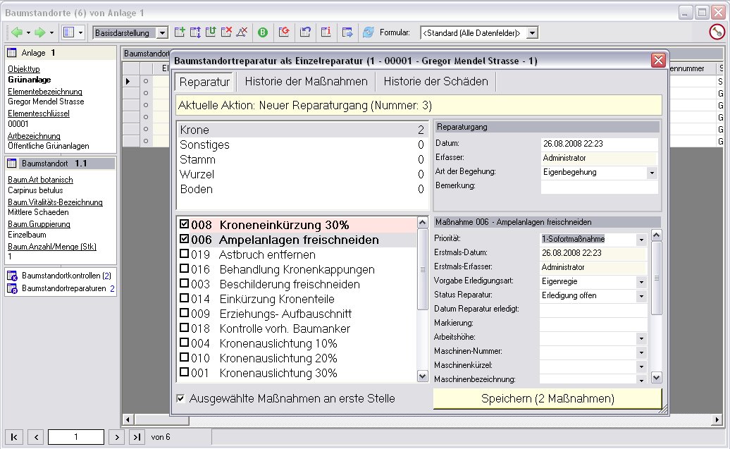 Erfassen eines neuen Reparaturganges mit Maßnahmen zu einem Baumstandort |