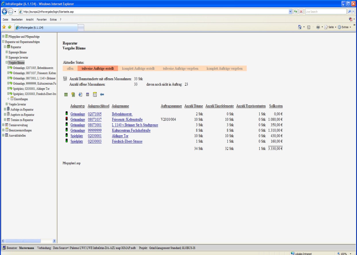 Reparaturplan Baumstandorte (für offene Maßnahmen an Bäumen) - Plan, hier gegliedert nach Anlagen |