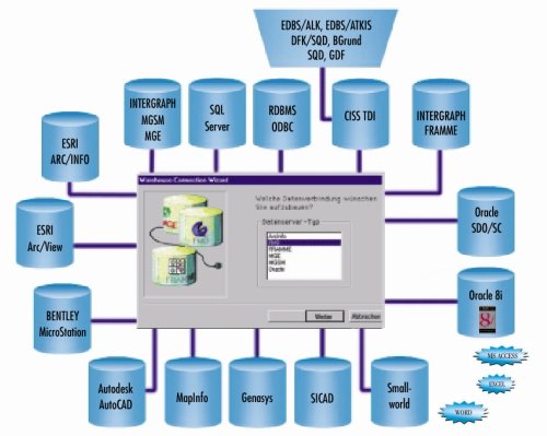 OLE/DB und ActiveX von Microsoft sowie die Interoperabilitätsanforderungen des OGC und ist daher in der Lage, unterschiedlichste Datenformate zu verstehen und zu bearbeiten.