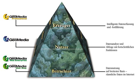 Merkmale von GeoMedia: Die GeoMedia-Produktfamilie ermöglicht die integrierte Nutzung und Analyse beliebiger heterogener Datenquellen, verfügt über leistungsstarke geoorientierte hybride Datenerfassungs- und Editierfunktionen, besitzt einen kompletten Satz von Analysetools für Leistungsexpertisen und gestattet komplexe Segmentberechnungen und eine Vielzahl von räumlichen Abfragemethoden: relational, arithmetisch, räumlich, logisch, Wildcard, nach Begriffen, Pufferzonen. GeoMedia – das umfassende geoorientierte Informationssystem. - Räumliche Datenbearbeitung in einer Client-Server-Architektur
